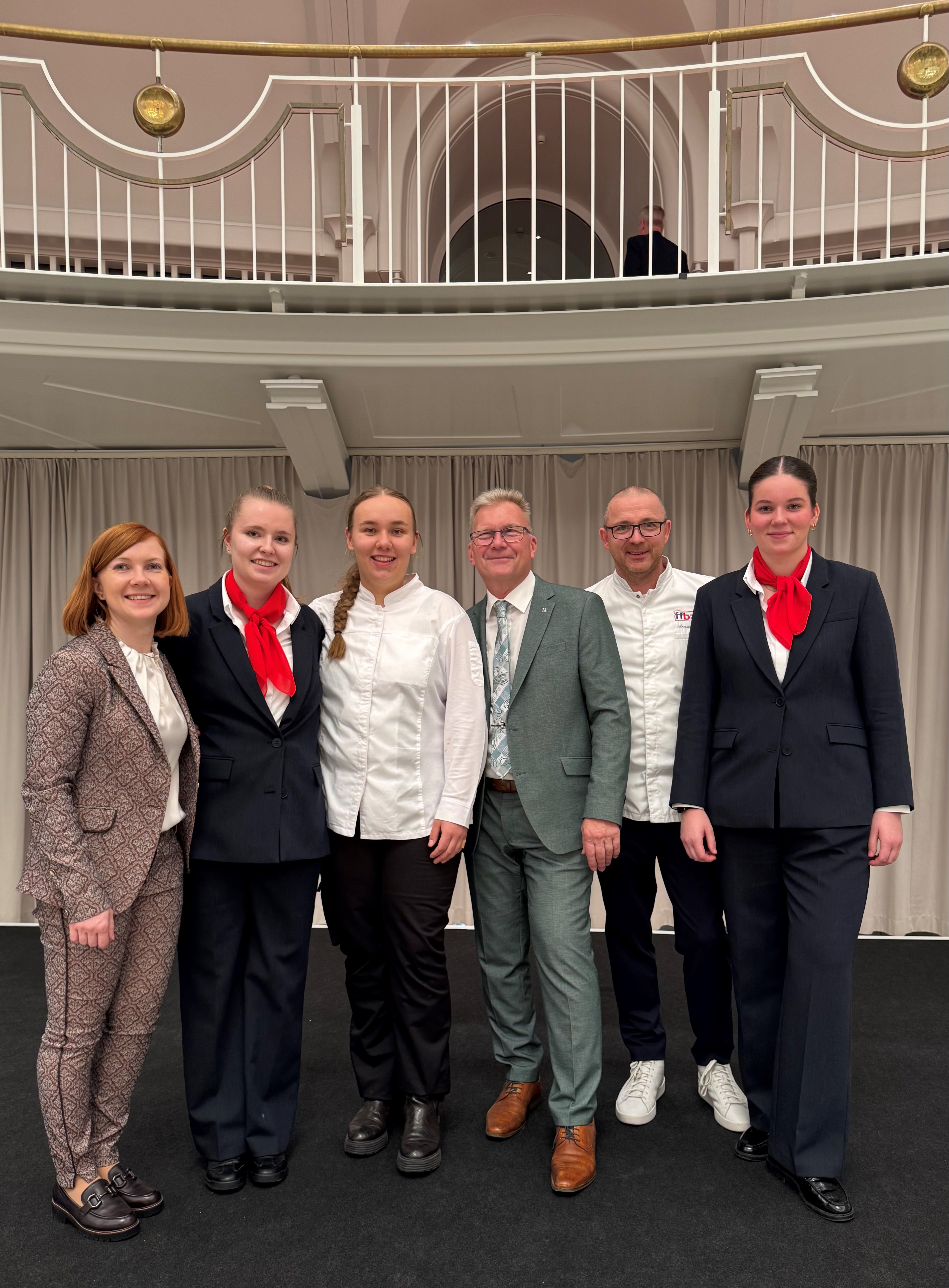 Königswinter. Großer Erfolg für den DEHOGA Lippe: Der lippische Gastronomie-Nachwuchs landete bei den Deutschen Jugendmeisterschaften für die gastgewerblichen Ausbildungsberufe auf dem zehnten Platz. Die deutschen Jugendmeisterschaften sind die erste Stufe einer steilen Karriereleiter - 51 Nachwuchsköchinnen und -köche, Hotelfachleute und Fachleute für Restaurants- und Veranstaltungsgastronomie traten auf dem Petersberg in Königswinter um die 43. Deutschen Jugendmeisterschaften an. Wer hier teilnimmt, hat sich bereits zuvor als Landesmeister in einem der 17 Landesverbände qualifiziert. Für das lippische Team waren die lippischen Jugendmeisterinnen Lina Wattenberg (Hotelfachfrau) aus dem Kurpark Hotel Bad Salzuflen, Ruth Schimanski (Köchin) von Infinity Events & Catering (Schieder-Schwalenberg) sowie Vivian Steinmair (Fachfrau für Restaurants und Veranstaltungsgastronomie) am Start. „Die 43. Deutschen Jugendmeisterschaften haben erneut Maßstäbe gesetzt und bewiesen, wie attraktiv, vielfältig und anspruchsvoll die Ausbildung im Gastgewerbe ist. Das hohe Maß an Professionalität und das starke Miteinander der Teilnehmenden sind inspirierend und ein starkes Signal für die Zukunft der Branche“ erklärte Guido Zöllick, Präsident des Deutschen Hotel- und Gaststättenverbandes (DEHOGA Bundesverband) zur feierlichen Siegerehrung im Steigenberger Icon Grandhotel & Spa Petersberg vor 400 geladenen Gästen. Zöllick dankte zugleich den Ausbilderinnen und Ausbildern, die sich mit Herzblut und Einsatz für die Fachkräfte von morgen engagieren. Zuvor herrschten in den Räumen des Steigenberger Icon Grandhotel & Spa Petersberg zwei Tage Wettkampfstimmung und Nervenkitzel pur. Auf dem Petersberg zeigte der Branchennachwuchs sein Können in Theorie und Praxis. Von schriftlichen Aufgaben über die Warenerkennung bin zum Zubereiten von Speisen und Getränken - gefordert waren Fachwissen, Präzision und Kreativität. Die Fachleute für Restaurants und Veranstaltungsgastronomie mixten Cocktails, deckten Tische ein und führten ein Verkaufsgespräch. Vivian Steinmair erreichte dabei insgesamt den achten Platz in ihrem Berufsfeld, bei den schriftlichen Aufgaben zur Fachkunde und zum Fachrechnen konnte sie sogar den sechsten Platz erringen. Die Hotelfachleute stellten ihr breites Know-how beim Rezeptionsgespräch, der Vorbereitung eines Hotelzimmers sowie mit innovativen Ideen für ein neues, nachhaltiges Hotel-Leitbild unter Beweis. Hier konnte Lina Wattenberg aus dem Kurpark Hotel Bad Salzuflen die Jury mit ihrem Konzept vollends überzeugen und erhielt die volle Punktzahl, gleichbedeutend mit dem ersten Platz in dem Teilgebiet. Spannend war auch die gemeinsame Teamaufgabe, bei der die Nachwuchskräfte aus Restaurant- und Hotelfach eine Bar-Karte entwickelten, Drinks kreierten und einen stilvollen Empfangsservice ausrichteten. Auch die Warenerkennung, bei der 25 Gegenstände quer durch das Berufsfeld der Hotellerie und Gastronomie (Lebensmittel, Spirituosen oder spezielle Arbeitsmittel) benannt werden mussten, wurde im Team absolviert. Hier zeigte sich das lippische Team nervenstark und landete auf dem fünften Platz. Den festlichen Höhepunkt bildete das Wettbewerbsessen am Sonntagabend, bei dem die Gäste von den Restaurant- und Hotelfachtalenten souverän und formvollendet durch den Abend begleitet wurden, bei jedem Handgriff beäugt von den kritischen Blicken der Jury. Die Nachwuchsköchinnen und -köche komponierten ein 4-Gang-Menü aus Vorspeise, vegetarischem Zwischengang, Hauptgang und Dessert. Grundlage war ein vorgegebener Warenkorb unter anderem mit Lachs, Auberginen, Kürbis, Wachteleiern, Rinderhüfte, Garnelen sowie Maronen und Ricotta. Bewertet wurden nicht nur Geschmack, Kreativität und Präsentation, sondern auch Sauberkeit am Arbeitsplatz, Zeiteinteilung, Rohstoffverarbeitung und Zubereitungstechniken. Ruth Schimanski, angehende Köchin bei Infinity Events & Catering (Schieder-Schwalenberg), überzeugte die Jury mit „Zweierlei vom Lachsfilet, gebeizt und Ceviche, an einem Birnensud, Auberginenchutney, in Rotwein konfierter roter Zwiebel und Birnen-Shisokresse-Sorbet“ als Vorspeise, gefolgt vom vegetarischen Zwischengericht „Petersilienwurzeltortellini auf Kürbissauce, dazu geröstete Walnuss und ein frittiertes Mollet-Wachtelei“. Im Hauptgang wurde „Scheibe von einer rosa gebratenen Rinderhüfte in einer Garnelen-Spinat-Farce, an einer Kalbsjus, mit glasiertem Rosenkohl und sautierten Karotten, dazu Kartoffel-Schnittlauch-Praline“ serviert, und „Ricottacreme mit einem Maronenkern auf einem Sablé-Boden, mit Ricotta-Himbeereis und geflämmtem Baiser, an einem Himbeerspiegel und karamellisierten Maronen“ rundete das Menü als Dessert ab. Nicht nur die Ehrengäste am lippischen Wettbewerbstisch waren begeistert, auch die Jury honorierte das Ergebnis mit dem achten Platz im praktischen Teil. „Unsere Teilnehmerinnen können zu Recht stolz sein auf ihre Leistung. Sie haben Ihr Talent und Ihre Kompetenz für Gastronomie und Hotellerie eindrucksvoll demonstriert, insbesondere, weil Sie alle noch in der Ausbildung sind und gegen bereits ausgelernte Junggastronomen angetreten sind“, gratulierte DEHOGA-Lippe-Präsident Holger Lemke dem Fachkräftenachwuchs, und ergänzt „Der zehnte Platz bedeutet, dass wir als kleinster Landesverband sieben Verbände hinter uns lassen konnten, die teilweise das zehn- bis hundertfache an Auszubildenden zur Verfügung haben.“ Sein ausdrücklicher Dank galt auch dem „Trainerteam“ Anna-Katharina Lemke (Die Windmühle Fissenknick) und Arnaud Brun, Küchenmeister und Fachlehrer am dem Felix-Fechenbach-Berufskolleg. Sie unterstützten die Auszubildenden in den Wochen vor dem Wettbewerb und während der Meisterschaften in Königswinter. „Ohne die vielen zusätzlichen Schulungen nach dem Unterricht im Felix-Fechenbach-Berufskolleg oder bei der Produktschulung im Handelshof Detmold wären so gute Ergebnisse kaum möglich“,